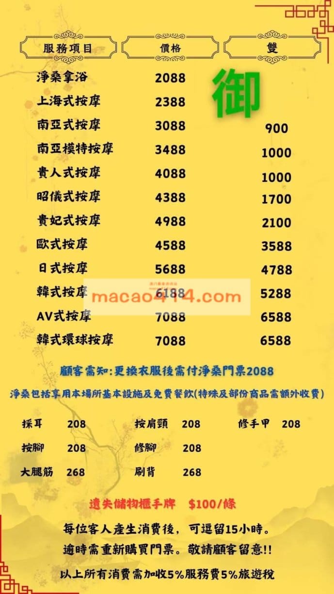 淨桑費(門票)1888 可以任用裡面設施,吃飯過夜(15小時內),一般含一個師傅工。上海式,2288,正規按摩 60分鐘。南亞式,3288,東南亞國籍女子服務60分鐘。南亞模特兒, 3688,東南亞國籍女子服務60分鐘,一般比南亞式漂亮點高一點。貴人式, 3888, 國人女子服務60分鐘。昭儀式, 4188, 國人,一般高一點,主觀比貴人漂亮點。貴妃式 ,4788, 一般這種理論國人天花板。 歐式, 4388,特指白種友人 多數是東歐,日式,5488, 一般是日籍,會說日語的,韓國, 5988,一般是韓籍,會說韓文的,av式,7288, 四線女優和長得特別好看的日籍,環球式,7288,頂尖韓裔。