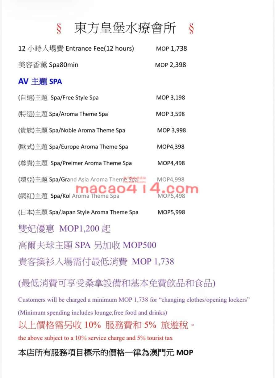 基本价格:净桑费1368,泰越2798,泰越星级3198,泰越超模3598,欧洲3998,中国4098,亚洲4498,环球5390,日韩5564,做全身按摩1700+可以免净桑费。 (2)注意有门店服务费:15%(场所收的,里面报价会含)。 (3)特别注意,东方皇堡的一个钟=50min