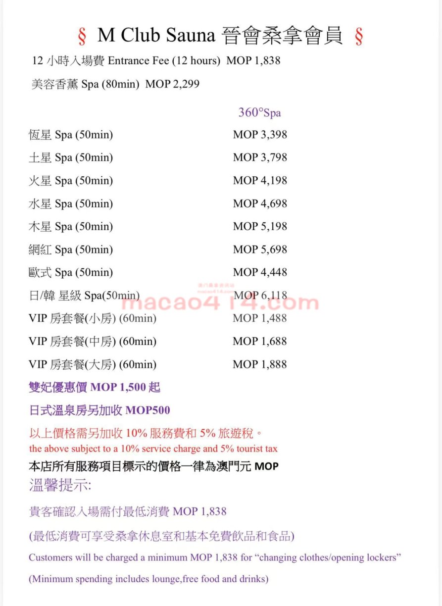 (1)基本价格(没优惠前):净桑费2038,泰越3598,泰越星级3998,中国4398,亚洲4898,欧4648,日韩6318,做全身按摩2499+可以免净桑费。 服务费:另付15%。